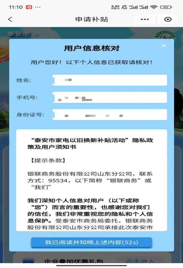 【申請(qǐng)補(bǔ)貼】用戶點(diǎn)擊進(jìn)入“家電補(bǔ)貼券申請(qǐng)”界面,系統(tǒng)彈窗提示授權(quán)申請(qǐng),用戶同意云閃付 APP 授權(quán)“魯換新”小程序獲取注冊(cè)手機(jī)號(hào)、姓名、證件號(hào)信息,進(jìn)入“用戶信息核對(duì)”界面,信息核對(duì)無(wú)誤后,點(diǎn)擊“我已閱讀并知曉上述內(nèi)容”。